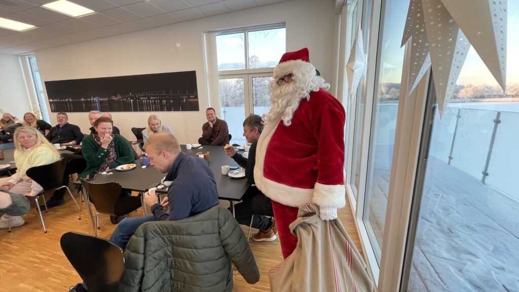 Under mødet dukkede julemanden op med sæk og gaver og fik en flot velkomst. Der var naturligvis en slikpose til alle, og så fik seks tilfældigt udvalgte medarbejder ellers fornøjelse af at pakke gaver op.