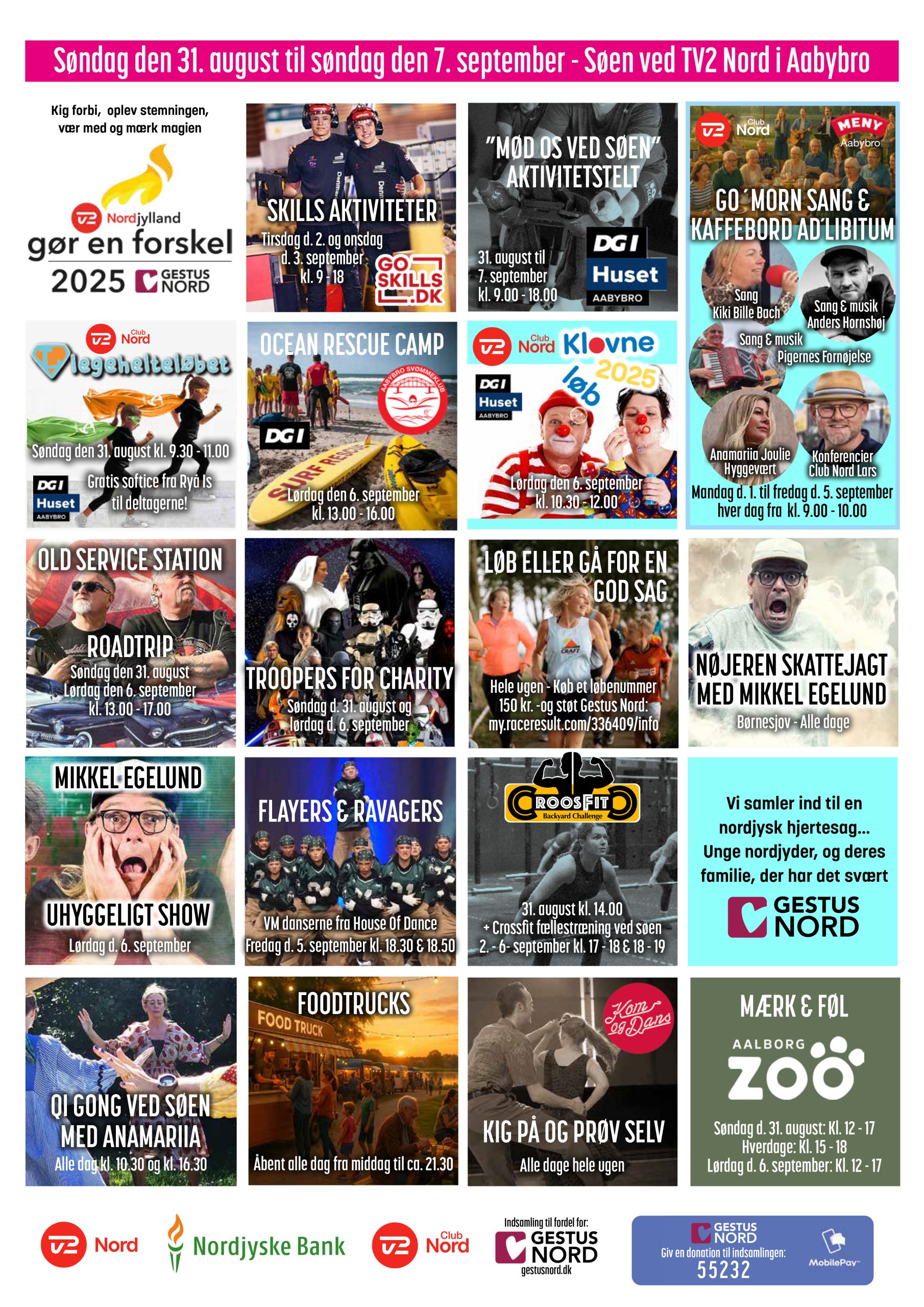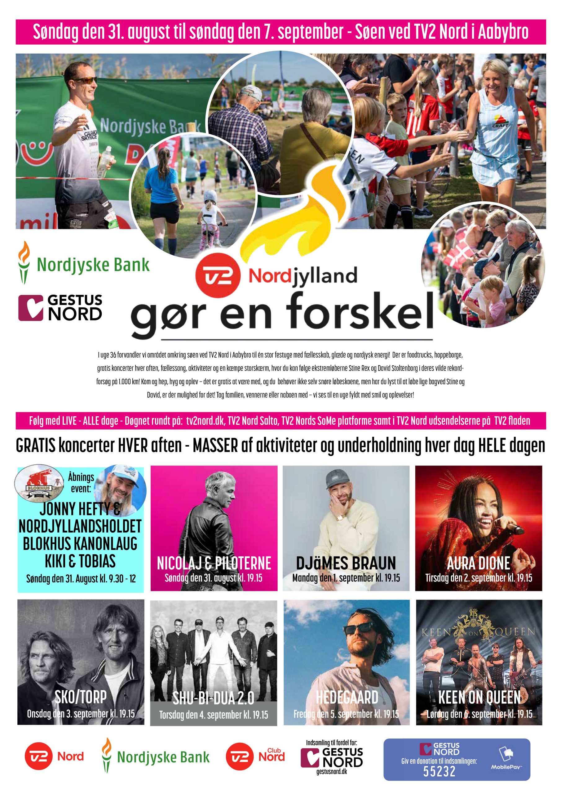 Arrangementet er en del af den store eventuge Nordjylland – gør en forskel, hvor hele området omkring TV2 Nord bobler af aktiviteter – fra morgen til aften – med foodtrucks, konkurrencer, koncerter, motionsløb og rekordforsøg. Vi sender live hele ugen og følger blandt andet ekstremløberne Stine Rex og David Stoltenborg i deres vilde rekordforsøg på 1.000 km omkring søen.