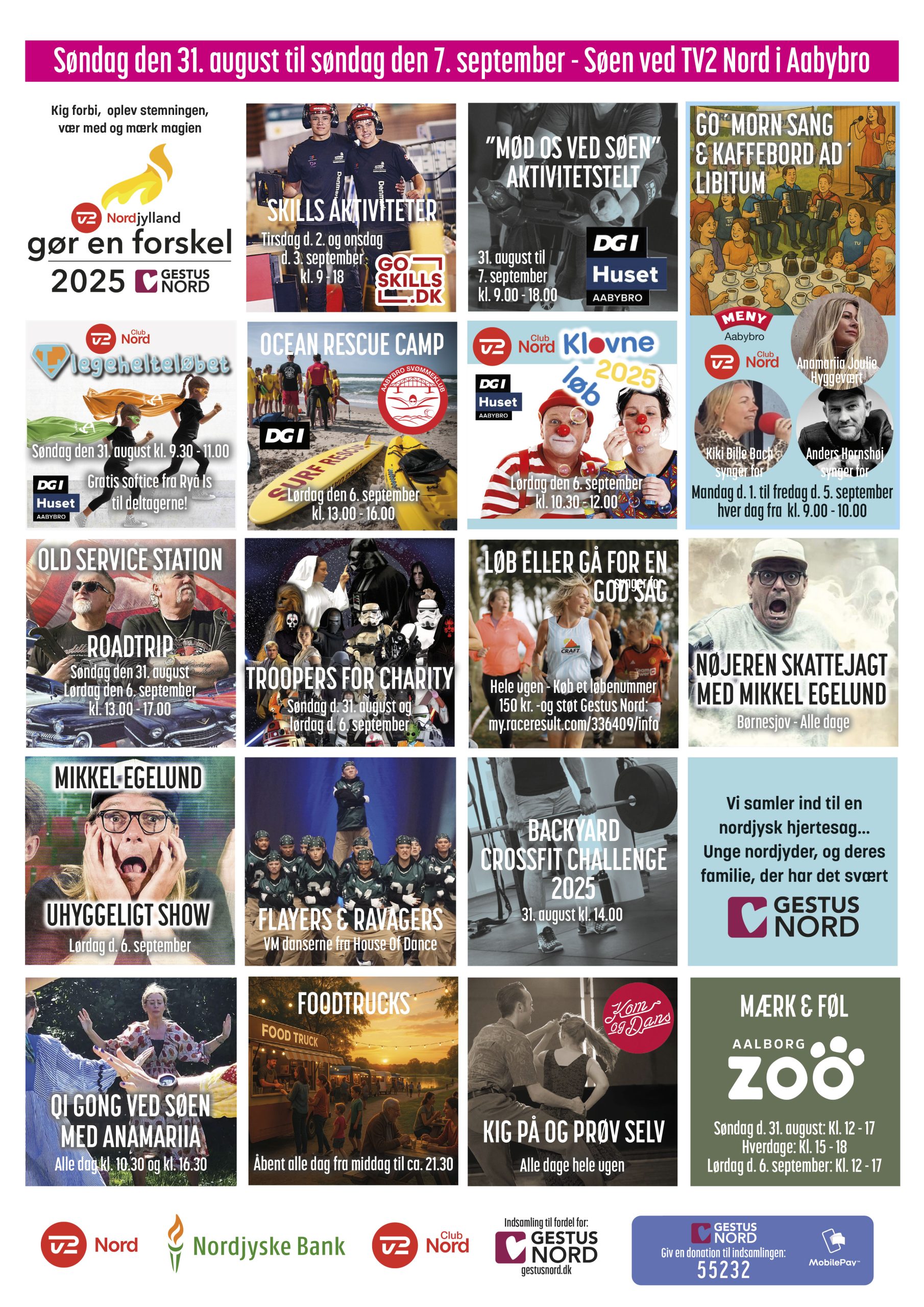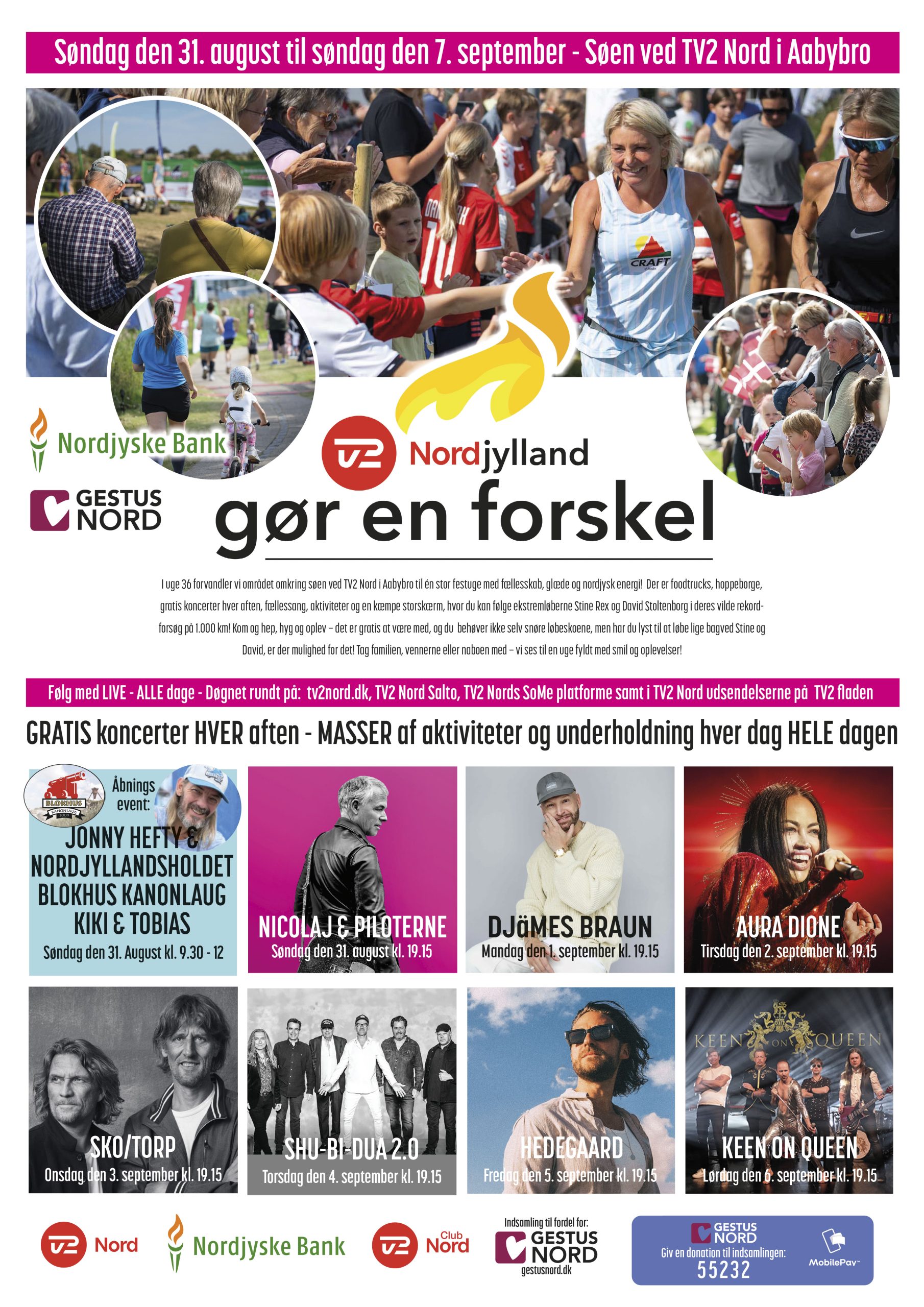 Fra søndag den 31. august til søndag den 7. september forvandler området omkring søen ved TV2 Nord i Aabybro sig til centrum for fællesskab, underholdning og velgørenhed. For tredje år i træk inviterer TV2 Nord og Ultra For Charity, i år i samarbejde med velgørenhedsorganisationen Gestus Nord, til en hel uge fyldt med koncerter, aktiviteter, foodtrucks og ikke mindst spektakulære verdensrekordforsøg.